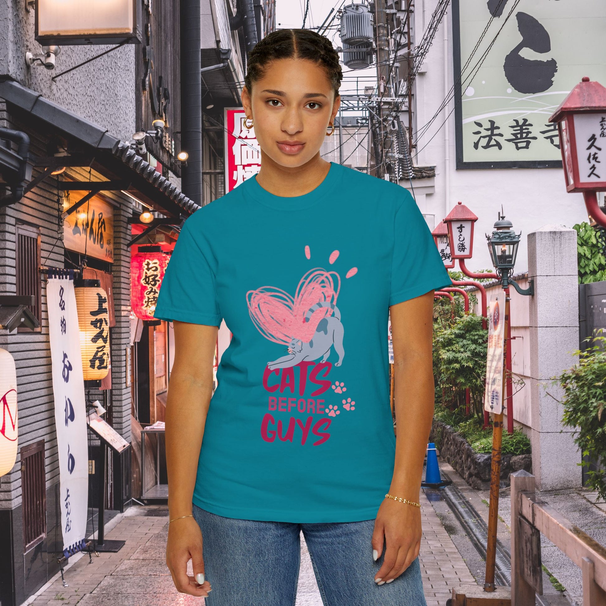 Cats Before Guys T-Shirt — Cute Heart & Playful Cat Graphic Tee