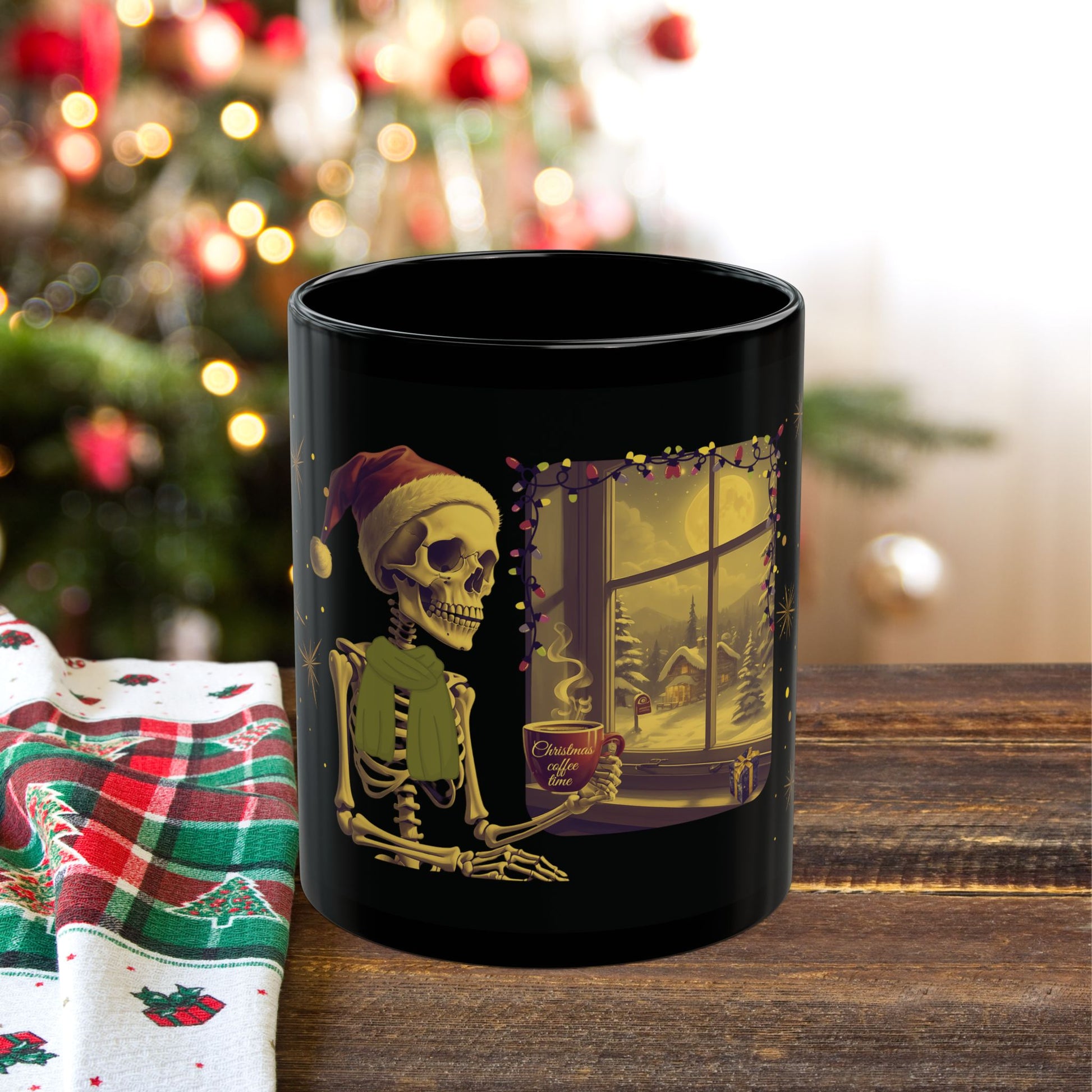 Enjoy a cup of coffee on Christmas night with this black ceramic mug. The glossy finish and vibrant colors make it perfect for cozy holiday evenings. Ideal for coffee lovers and those who enjoy festive decorations.