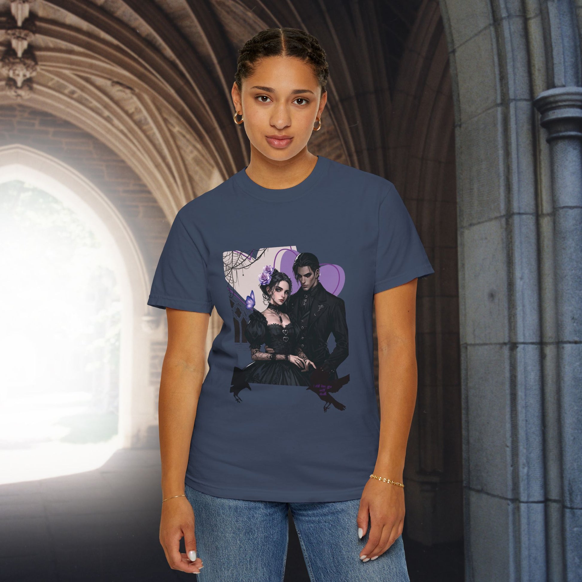 A gothic couple inspired t-shirt perfect for celebrating Valentine's Day. This unique design gives off a moody and romantic vibe, making it a great gift for couples or individuals who appreciate dark romance. Ideal for Valentine's Day celebrations and gothic style enthusiasts.