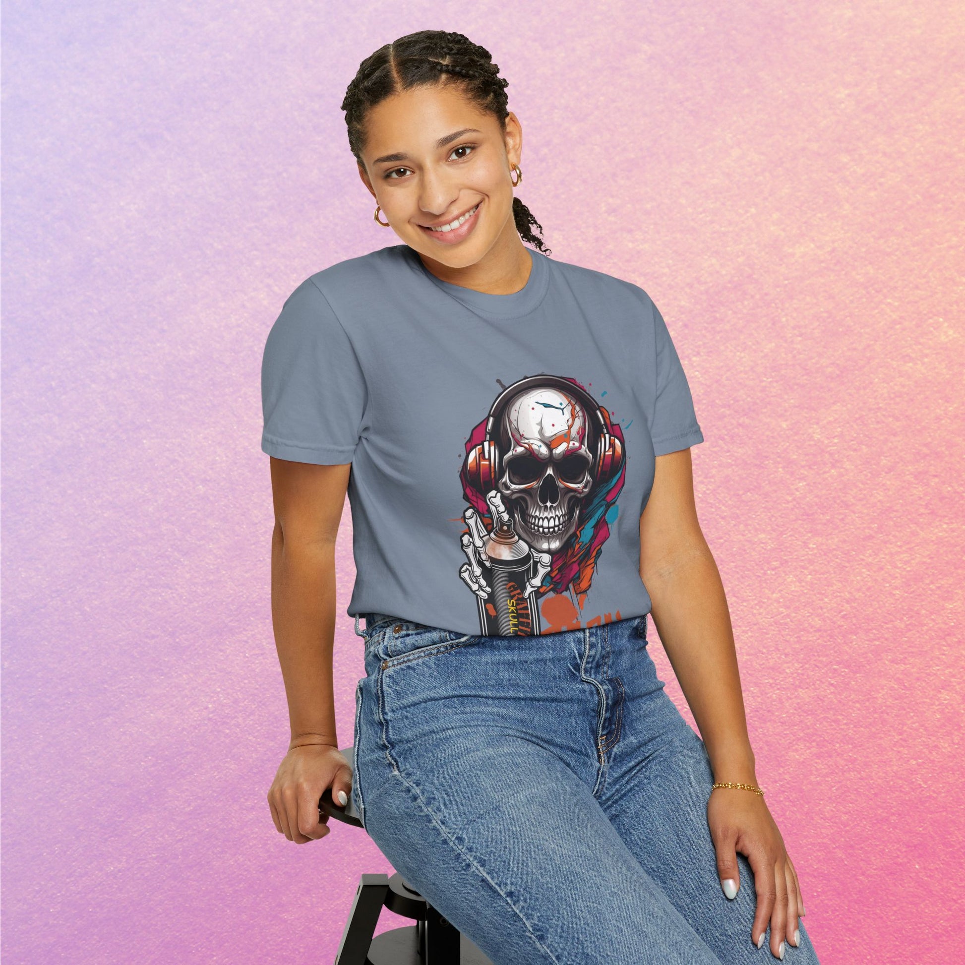 A trendy and edgy T-shirt featuring a skull that loves to do graffiti. This garment gives off a rebellious and artistic vibe, perfect for those who appreciate street art and urban style. Ideal for casual wear or a standout piece for a relaxed look. Perfect for Halloween, street art enthusiasts, and anyone with a bold sense of style.