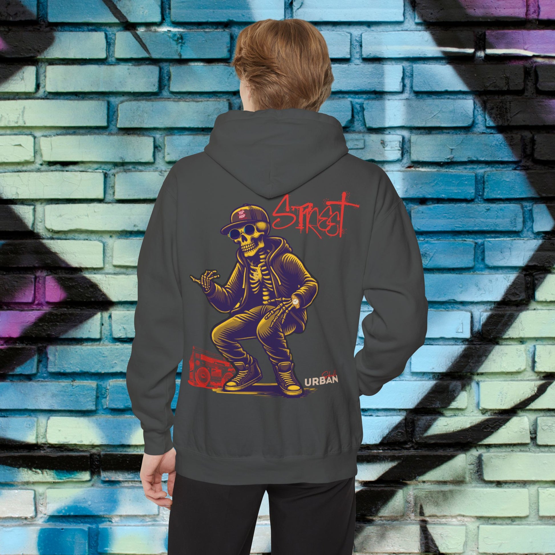 This garment-dyed hoodie carries the grit and rhythm of old-school hip hop with a skull motif that feels more like a story than a logo. It sits roomy and relaxed, hood pulled up against late-night city breezes, and the heavy, soft fabric absorbs rhythm and wear — becoming more lived-in with every set and cipher. The skull design reads like a street sketch: bold lines, attitude, a nod to freestyle energy and concrete nights. Wear it to the studio, to a block party, or on slow walks through neon-lit streets. The interior jersey-lined hood and sturdy neck tape keep it comfortable through long sessions, while the weight and structure hold the print with presence. This is for people who collect memories in beats and alleyways — a hoodie that ages with you and keeps the music close.