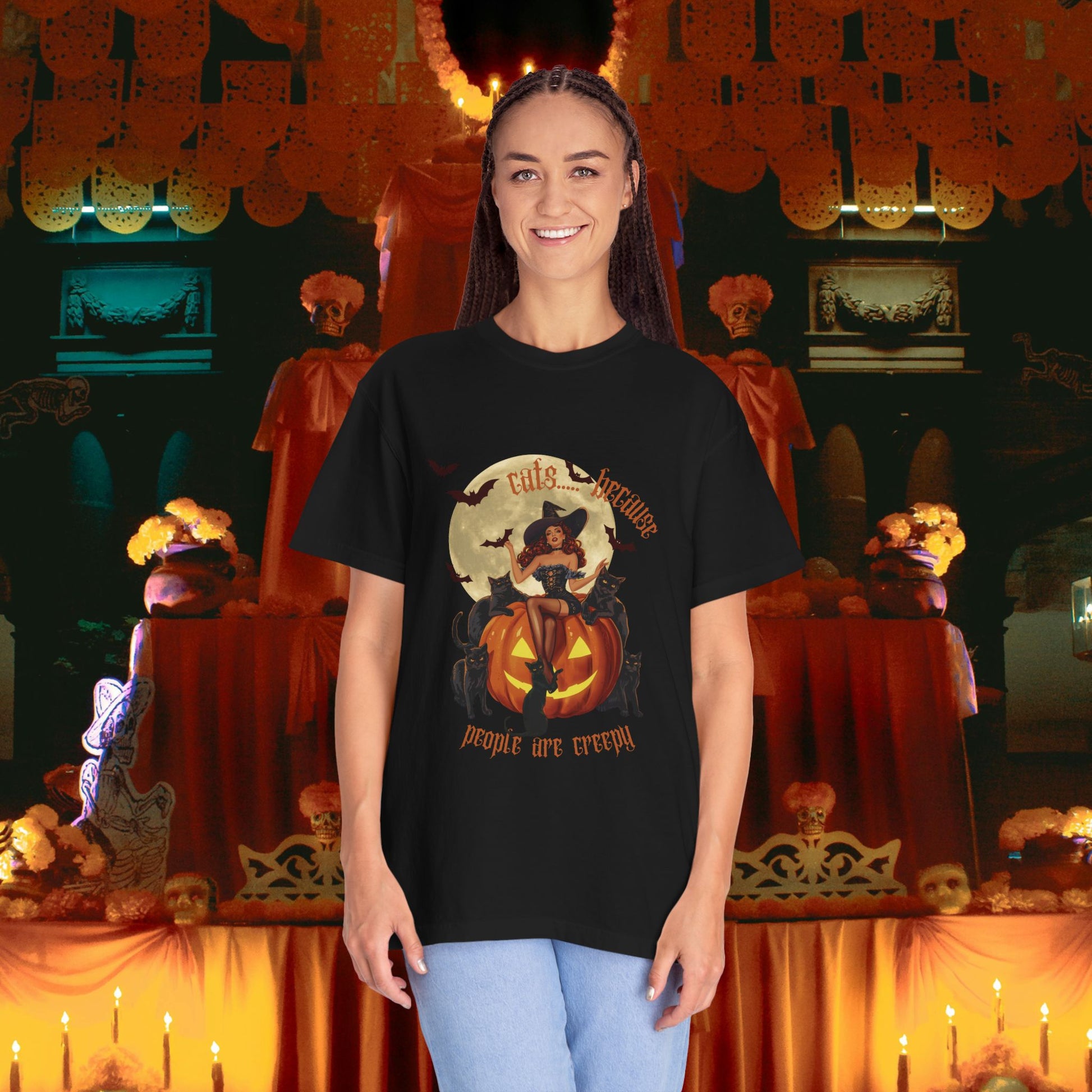 This T-shirt features a beautiful pin-up style witch with the phrase 'cats because people are creepy'. It gives off a fun and quirky vibe, perfect for those who love unique and bold designs. Ideal for Halloween enthusiasts, cat lovers, and anyone who enjoys a touch of humor in their wardrobe.